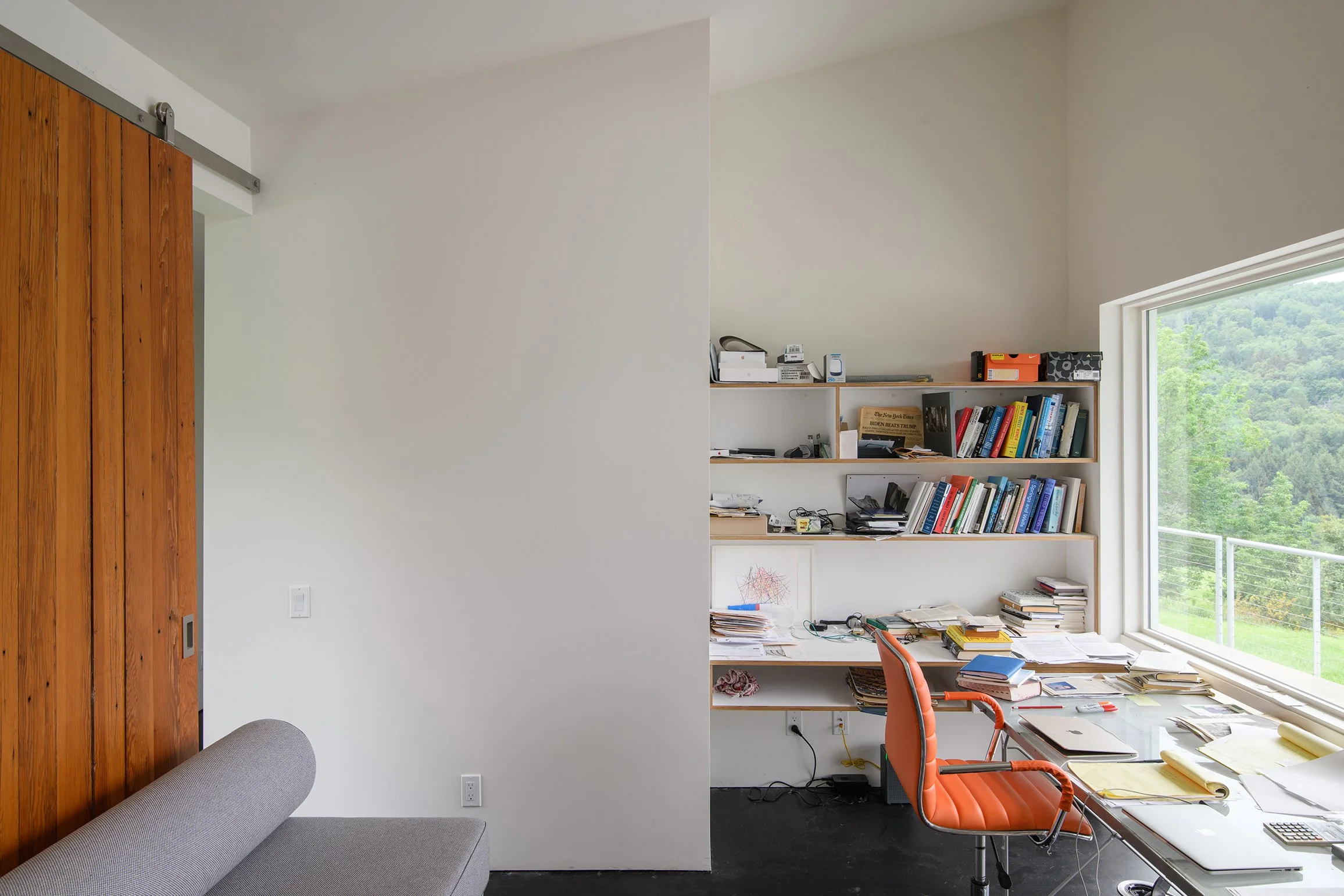 This 2,000 square foot three-bedroom house in the Catskill Mountains of Upstate New York is sited near the center of a 48 acre former dairy farm. The single-story house’s massing hugs the undulating landscape, cascading down the hillside in three levels, articulating public and private spaces with the level changes. Oriented to take advantage of winter sun and spectacular valley views, the slender building also bends in plan to conform to the site topography and further delineate public and private areas. Family functions – cooking, eating, socializing – separate the secondary bedrooms, one of which doubles as a drum studio and the other a writing office. All spaces are linked by direct access to a long, trellised porch that bridges the south facing façades and provides solar control and an expansive outdoor room from which to enjoy the landscape.