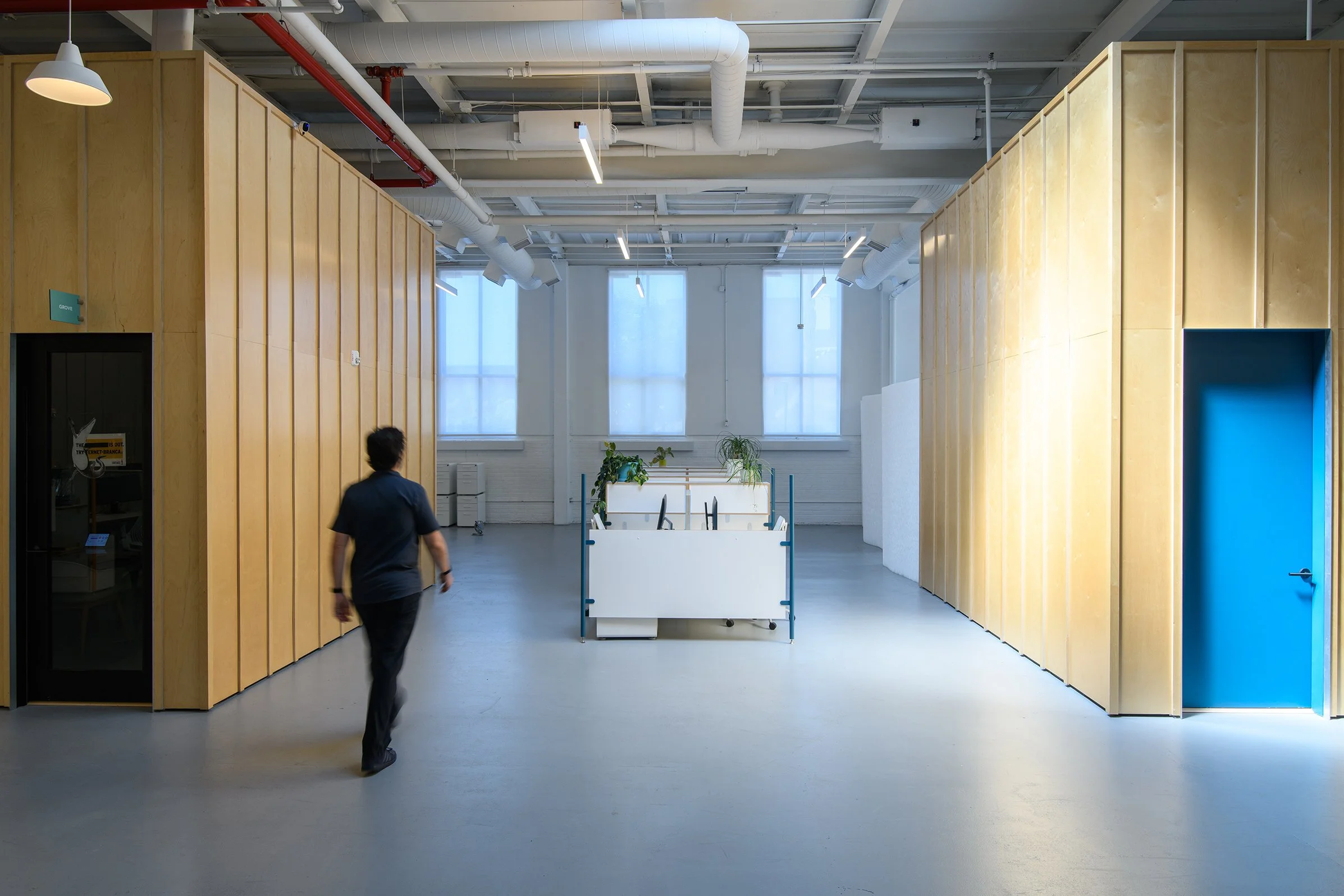 An existing 22,000 square foot industrial building in Brooklyn, formerly used as a bakery, is being converted into an office and production studio for a creative agency. PSF Projects worked collaboratively with the clients to develop and implement new strategies of organization that reflect the client’s fluid and changing business. A variety of open and private work and meeting areas have been created by carefully locating a series of simple wood-clad volumes throughout the vast space. Large open areas and a series of skylights allow daylight deep into the previously dark building.
